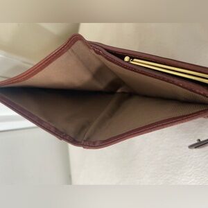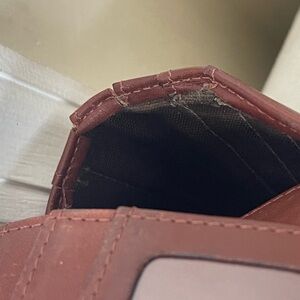 Compact leather wallet featuring an embossed Coach logo. Rich brown leather with stitched trim. Simple, elegant style for everyday use. Has minor Conner rubbing. Inside has minor signs of wear.