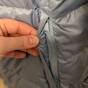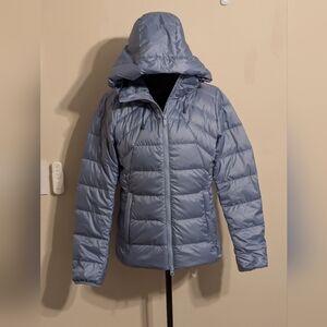 Light blue hooded puffer with full front zip. Quilted insulated design for cozy warmth. Zippered hand pockets for secure storage. Adjustable hood with drawcord for a snug fit. Lightweight, packable shell for easy travel.