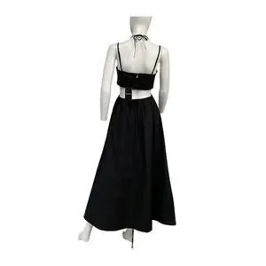 Strappy halter maxi dress in black with a front waist cutout and a gathered skirt. This garment features features adjustable straps and a back zip closure.