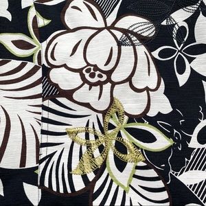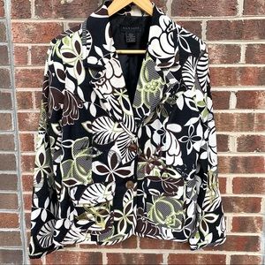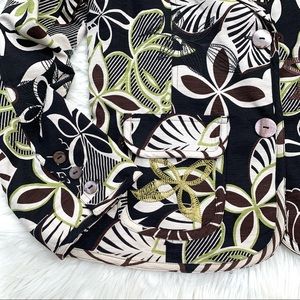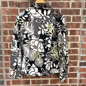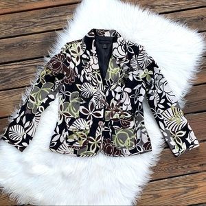 Silk Land Women’s Black, Brown, Cream & Green Floral Embroidered & Fully Lined Lightweight Blazer with 2 Front Pockets, Sewn in Shoulder Pads and 3 Button detail on sleeves. Size Medium in Excellent Preowned Condition.