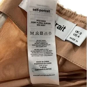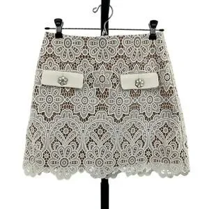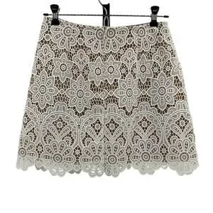 Ivory floral guipure lace mini skirt with a scalloped hem and nude lining. Made from 100% polyester.