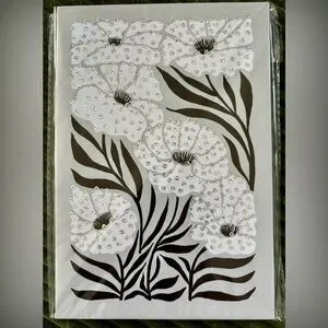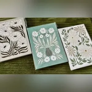 Set of three floral wall hangings. Features intricate flower designs in green, white, and cream with additional sparkling design accents. Easy to hang and fun to arrange in a variety of ways. Each picture measures 6”x9” and comes in a protective plastic sleeve.