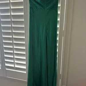 Elegant strapless maxi dress in deep emerald green. Fitted, ruched bodice and a smooth flowing skirt create a flattering silhouette. Perfect for formal events and evening occasions. There is a little bit of pilling but you can only tell up close! Nothing too major