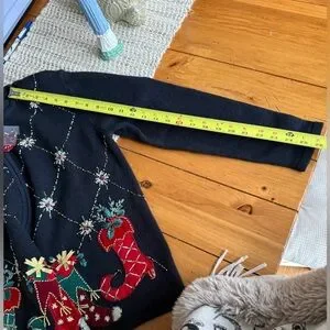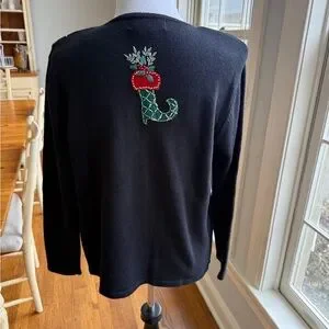 Festive black zip-front cardigan. Embroidered holiday stockings in red and green with gold accents. Diamond and star sequin detailing across the front. Cute jeweled zipper pull. Cozy and decorative holiday piece.
