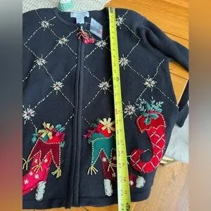Heirloom Collectibles 2004 Y2K Black Zip Up Christmas Cardigan Sweater w/Red & Green Stockings Ugly Sweater Size M. NEW old stock.