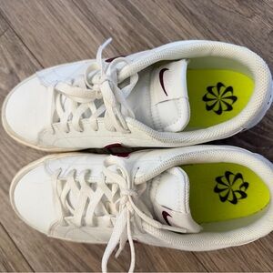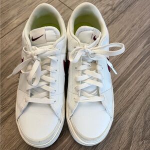 Stylish white sneakers featuring a maroon swoosh. Perfect for casual wear. 9.5. Some imperfections as shown.