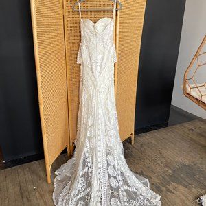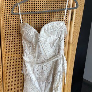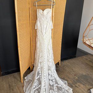 Bought for wedding and it didn’t fit my shape well, so it’s been in a box for a year. Clean, but could use a wash for the bottom trim.