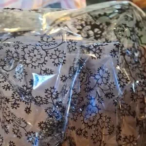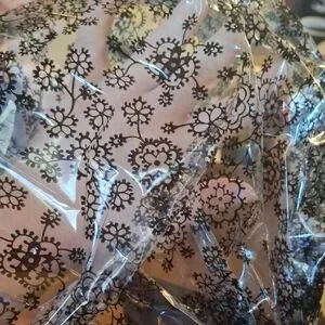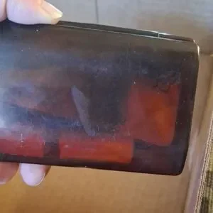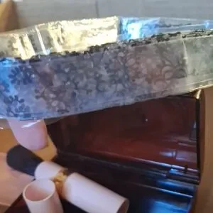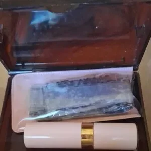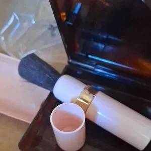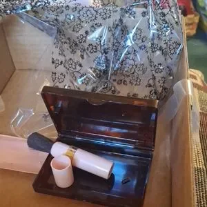Compact makeup brush with pink handle and gold ferrule. Comes with a brown translucent travel compact. Lightweight and portable. Great for touch-ups on the go. Also included is an emergency rain scarf. I showed how it folds in several pictures. It is a reusable plastic bandana.
