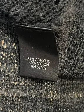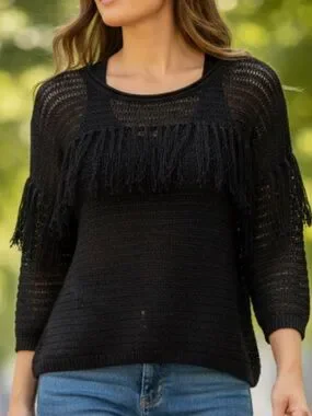 Chelsea & Violet knit, see-through sweater top in NWT condition. Very lightweight, flowy, and breathable. Could be worn all seasons. Could be used as a beach cover or wear a tank underneath. Stylish fringe across the chest. Relaxed silhouette with a high-low hem for easy layering. 3/4 sleeves. Versatile black color pairs with jeans or skirts. Approximately 22” in length in front at shortest section, 29” in length in back longest section, 21.5” pit to pit laying flat.
