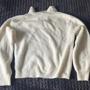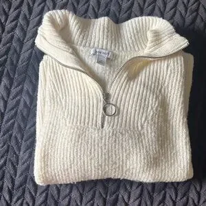 Elegant cream sweater with a textured knit. Features a stylish quarter-zip design.