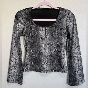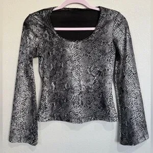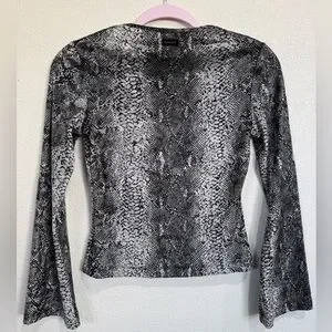 Vintage GUESS Y2K snakeskin print long sleeve top in black and gray with a flattering fitted silhouette and soft stretchy fabric. This early-2000s piece has the perfect Y2K edgy vibe and works great for a night-out or trendy streetwear look.