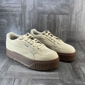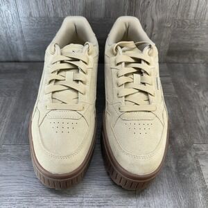 Stylish Puma sneakers in beige with a brown sole. Suede texture. Perfect for casual wear.