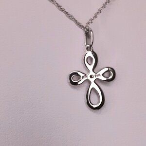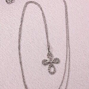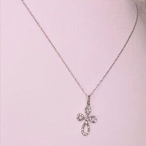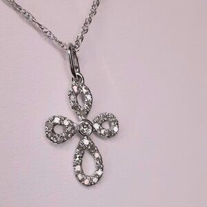 NEW 14kt white gold and diamond cross necklace. Cross measures approximately 1/2 inch long and 3/8 inch wide on a 17 inch chain. Petite, delicate, elegant and beautiful.