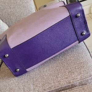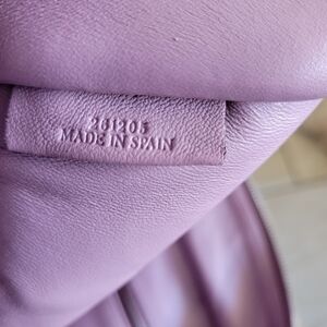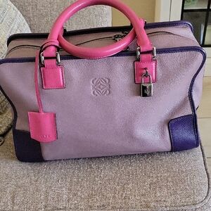Loewe satchel in soft lilac leather with vibrant pink handles and purple trim. Structured silhouette with zip closure and polished hardware. Comfortable top-handle and detachable strap options. Distinctive color-block design and embossed logo. This is the 36cm size.