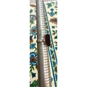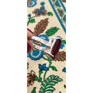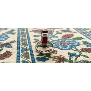 Vintage ring with a deep red rectangular stone. Sleek band with a reflective silver-tone finish. Minimalist, modern style. Striking color contrast.