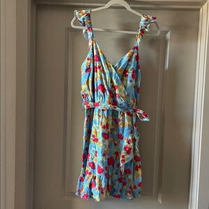 Light blue dress with multicolored floral accents. Elastic waist with a fabric belt that ties at side. Soft, flowy fabric for warm days.