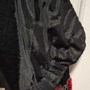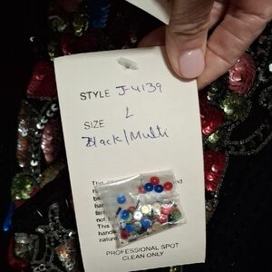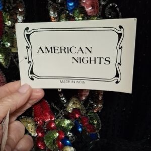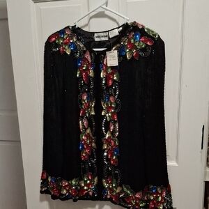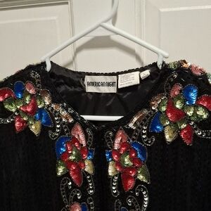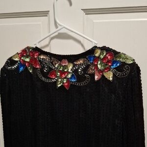 Black embellished cardigan featuring multicolor sequin and bead floral appliqués along the front, collar, and hem. Lightweight knit that elevates evening outfits. Available in black with red, green, blue, pink, and gold accents.