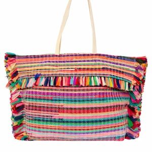 Leave a trail of color when you take the RAJ Oversized Guatemala Tote Bag with you on your next vacay! Lightweight woven cotton (in an allover rainbow striped pattern) creates an oversized silhouette with a flat bottom design and multi-colored fringe trim along the sides and the fold-over top.