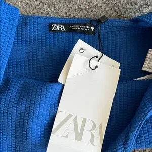 Zara ribbed crop top in a vivid blue. Tank top with wide straps. Stretchy knit fabric for easy wear. Clean, minimalist look that layers well.