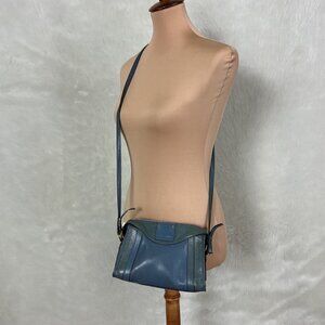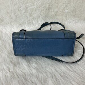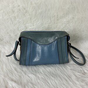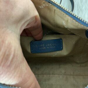 This is a two tone gray blue and blue leather, leather adjustable, removable crossbody strap, zipper closure crossbody bag from Marc Jacobs. Made in Italy. Gold tone hardware. Rub wear on edges. Marks on the inner lining. Some of the brand spell out gold tone label has rubbed off. No chain strap.