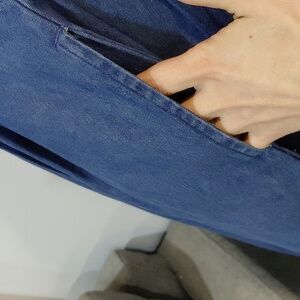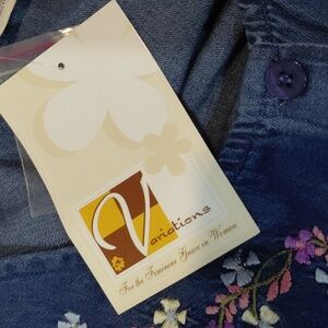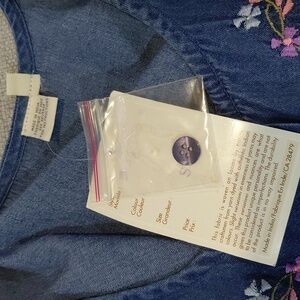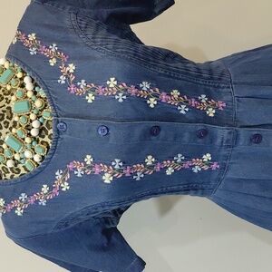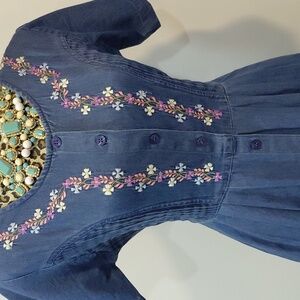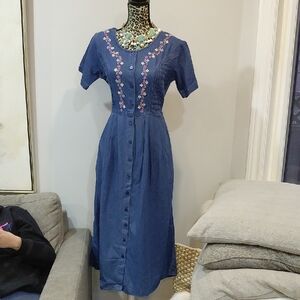 Classic denim dress with delicate floral embroidery along the neckline. Button-front styling for easy wear and a flattering waist. Short sleeves and soft, comfortable fabric for everyday elegance. Versatile blue color pairs well with sandals or heels. fits S/M