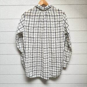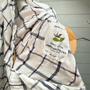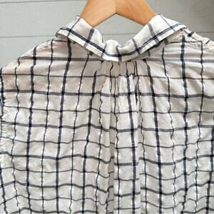 american colors top, organic cotton shirt, windowpane grid shirt, white navy grid top, crinkle cotton top, button front shirt, relaxed button up, lightweight cotton shirt, organic cotton button down, windowpane check shirt, white navy top, gauze style shirt, ethical fashion top, sustainable cotton top, slow fashion, effortless style, capsule wardrobe shirt, elevated basics, boho casual top, women medium shirt, airy cotton blouse, coastal style, madewell style, eileen fisher style, weekend outfit, layering shirt, spring summer top, thrifted organic, secondhand sustainable, clean girl aesthetic
