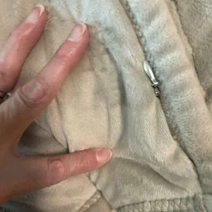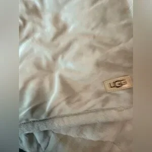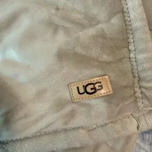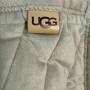 Plush quilted comforter set by UGG. Soft, textured chevron quilting. Neutral light beige/cream tone. Includes matching shams. Cozy, upscale bedding look.
