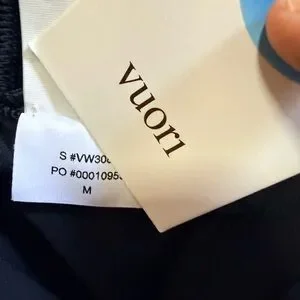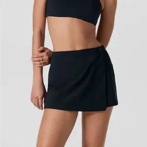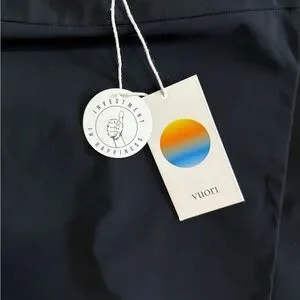 Sleek black athletic skirt from Vuori. Smooth, performance fabric with clean lines. Branded hanging tags add a designer touch. Ideal for workouts or casual wear.