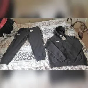 Black Puma zip hoodie with contrast white logo. Matching black joggers with branded side trim. Sporty set for casual wear. Never worn.