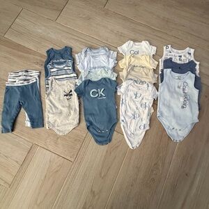 Assorted PRE-LOVED Calvin Klein baby bodysuits and separates. Includes logo and CK monogram pieces. Mix of solid, striped and patterned styles. Soft blue and gray tones with navy accents. Versatile neutral set for everyday wear.