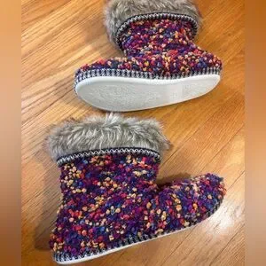 Cozy confetti knit slipper boots with a multicolor pom-pom texture. Faux-fur cuff for added warmth. Soft cushioned sole for indoor comfort. Easy slip-on style with decorative contrast trim.