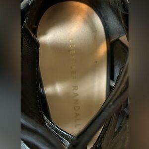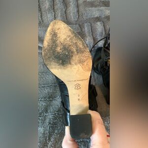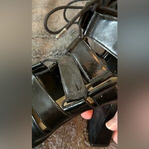 Patent-look pointed toe with cutout cage straps. Lace-up ankle ties for adjustable fit. Sleek black finish with modern edge. Versatile design for day or night wear. In good pre-owned condition. No damage I can see but seem to have a film on them from storage so could use a good polish. Size 9. 3.5 inches across heel. Gorgeous shoes! Thank you for looking!
