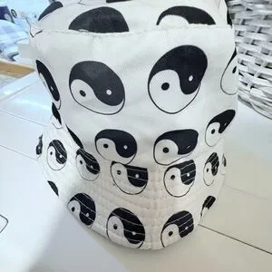 Bucket hat featuring a black and white yin yang print. Lightweight, breathable fabric for everyday wear. Stylish and easy to pair with casual outfits. Comfortable brim for sun protection and playful design. OS