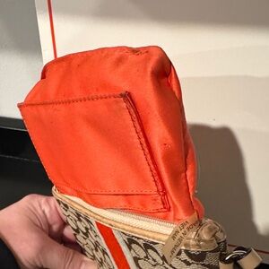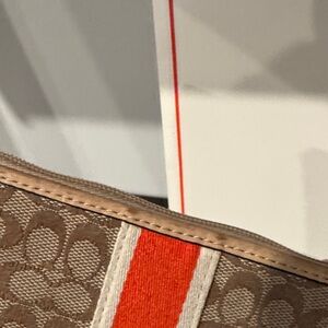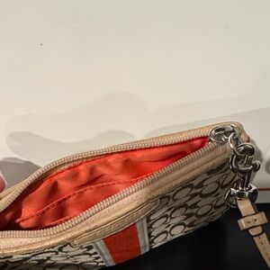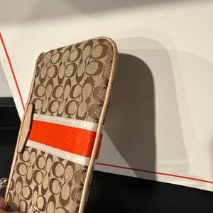 Coach wristlet in brown signature canvas. Features a bold red center stripe with cream edging. Wear exists on all leather trim and detachable wrist strap. Sleek design for daily essentials.