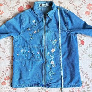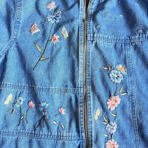 Passion denim jacket with beautiful floral and butterfly embroidery throughout. Collar neckline, long sleeves, and lightweight denim!
