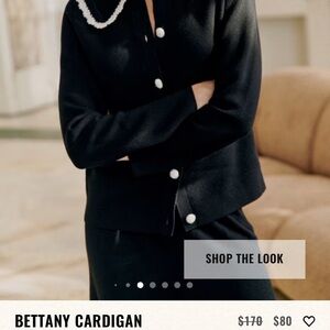 Elegant black cardigan. Features white trim and buttons. Perfect for layering.