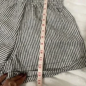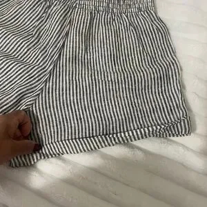 High-waist shorts with an elastic waistband. Vertical light gray and white stripes. Side pockets for convenience. Soft, breathable fabric for warm days.