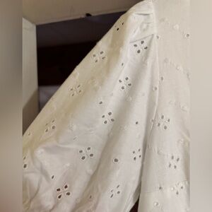 Material: Shell: 100% Cotton; Lining: 100% Polyester Elegant white blouse with eyelet pattern. Features a V-neck and short sleeves. Perfect for casual outings. Great for doing or holiday