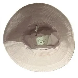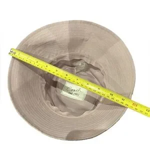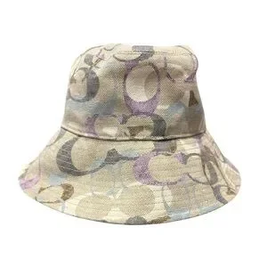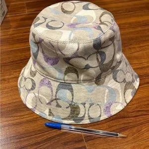 Stylish bucket hat with a unique signature pattern. Features shades of beige, purple, and gray. Size S, 7”