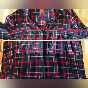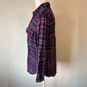 Joe Fresh flannel, Joe Fresh button down, navy red plaid shirt, women’s plaid top, rayon flannel shirt, relaxed fit plaid, V neck button down, soft plaid shirt, casual fall top, Joe Fresh medium, long sleeve plaid shirt, cozy plaid blouse, everyday flannel style top