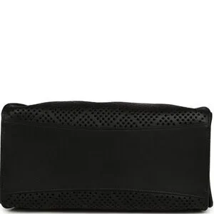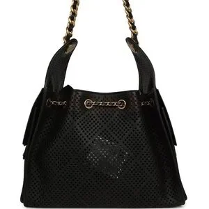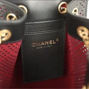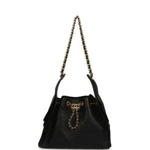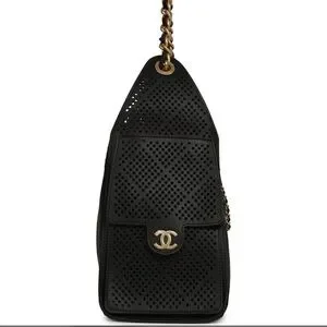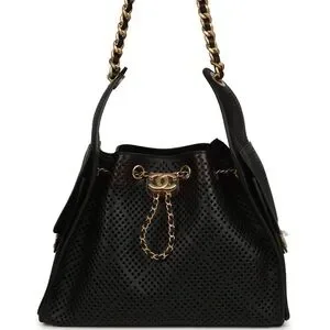 This Chanel Small 25 Hobo Bag is in black perforated calfskin leather with antique gold hardware, featuring perforated calfskin leather, two exterior side pockets, drawstring closure, and a single interwoven antique gold and back leather shoulder strap.