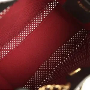 The interior is lined in burgundy perforated suede lining and one small floating slit pocket on the side.