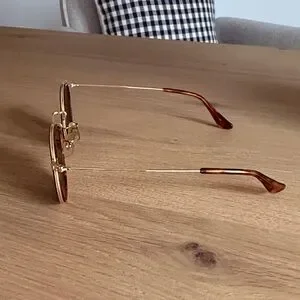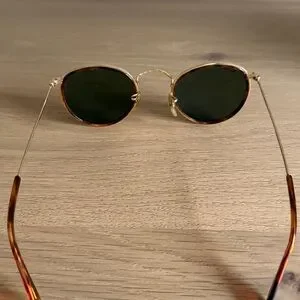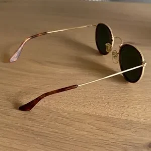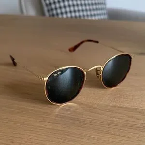 Elegant Ray-Ban sunglasses featuring gold frames and dark lenses. Perfect for a chic look. Comes with case!