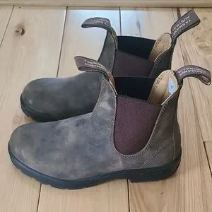 Classic Blundstone Chelsea ankle boots. Durable leather upper with elastic side panels. Pull tabs for easy on and off. Cushioned sole for everyday comfort. Timeless, versatile design.