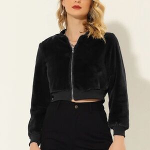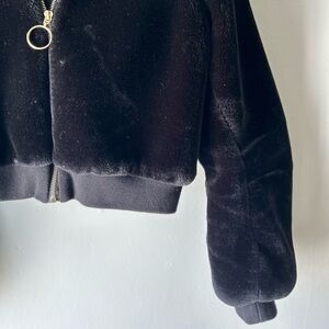 Soft fuzzy bomber jacket in classic black with contrasting gold zipper. Perfect for nights out on chilly evenings. Modest cropped coat in excellent used condition.