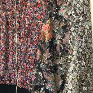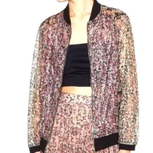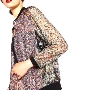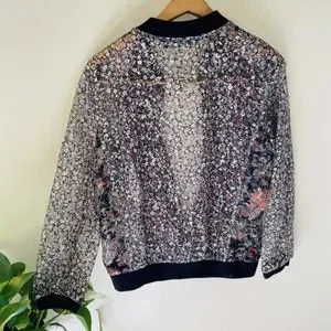 Stylish Zara bomber jacket. Features a multicolor floral pattern. Black trim accents. Perfect for casual wear.