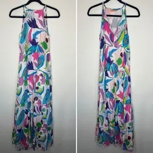 Vibrant maxi dress with a playful pattern. Features a sleeveless design and flowing silhouette. Perfect for summer outings.