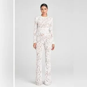 Elegant white lace jumpsuit with full-length sleeves. Sheer floral lace overlays a nude lining for a feminine look. Fitted waist creates a flattering silhouette. Perfect for formal events and evening wear.