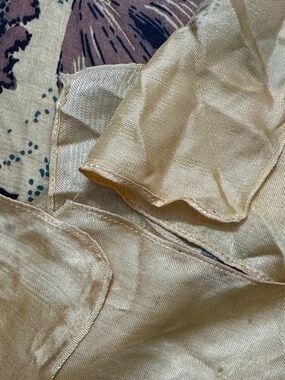 Bold yellow vintage scarf with tropical hula girl and palm motifs. Large "ALOHA HAWAII" lettering. Vibrant green foliage and black text accents. Light cream highlights throughout. Soft drape and vivid print. Also features embroidery on the palm trees. 31” x 32”