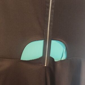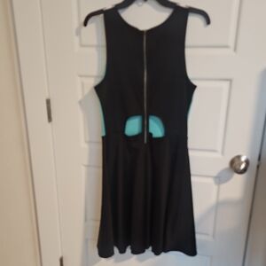 Elegant sleeveless mini dress with a teal bodice and black skirt. Perfect for stylish outings.